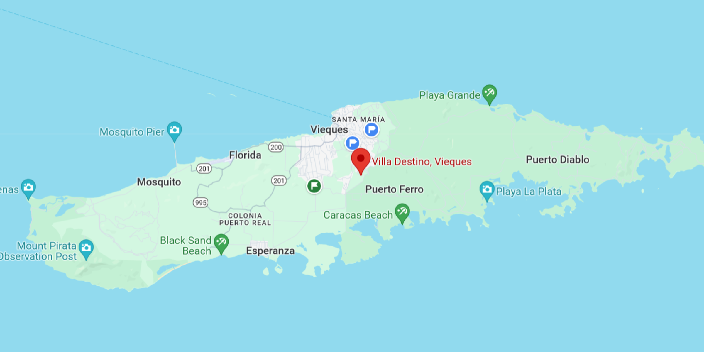 Fly into San Juan International (SJU). Once you arrive in San Juan, you will need to get to Vieques - there are a number of options that vary by cost and time. The easiest option (but most costly) is to fly from San Juan directly to Vieques. The least expensive (but most time consuming) is to take a taxi to the Ferry at the Ceiba ferry port. It's about a 1 hour taxi ride and a 30 minute to 1 hour ferry ride to Vieques. Two options in between are to fly out of either Isla Grande or Ceiba, both of which are less expensive than flying from San Juan International, and take less time than the ferry. The option you choose below may also be dependent on the time of your arriving or departing flight to or from SJU.